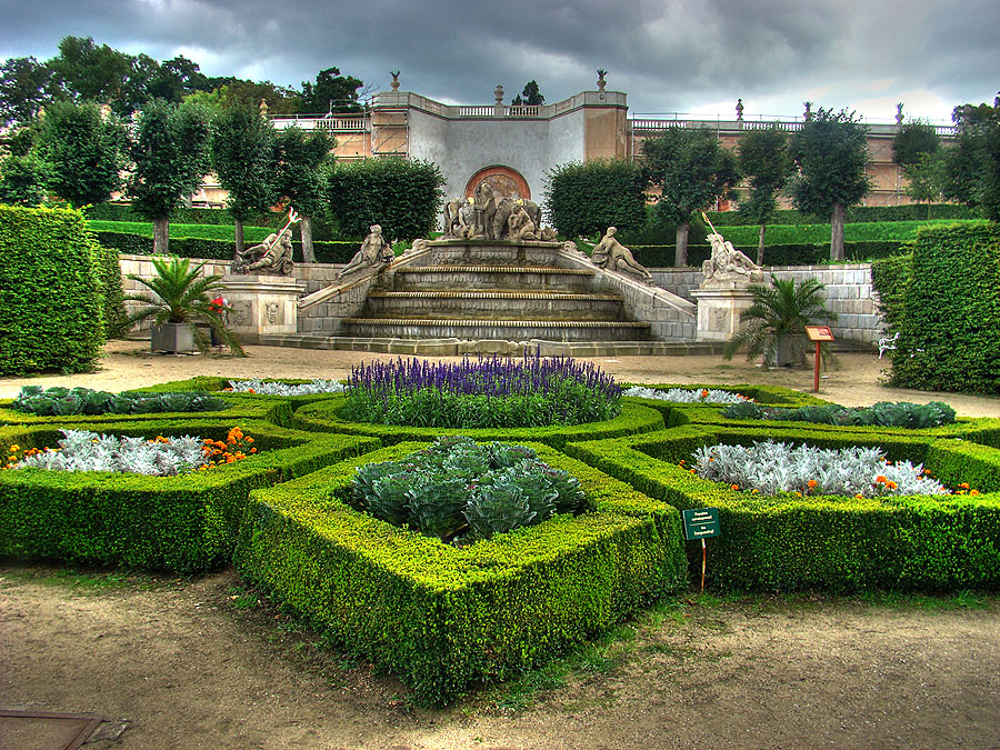francouzská zahrada záhony před fontánou jedna ze soch na fontáně Heliových koní pohled na zámek od fontány