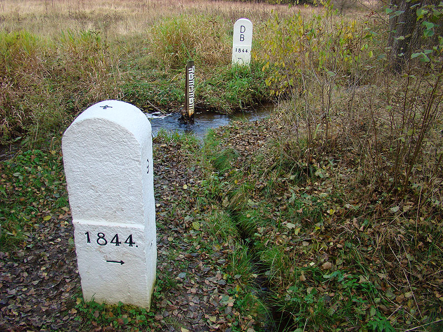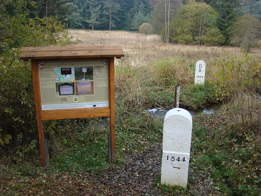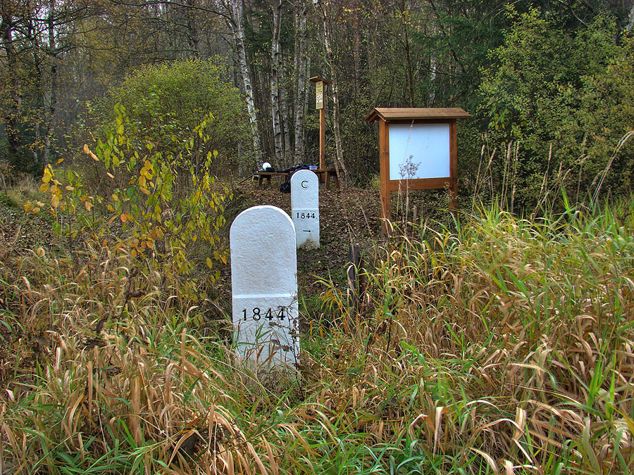 hraniční kameny (v popředí německý) na břehu Újezdského potoka |