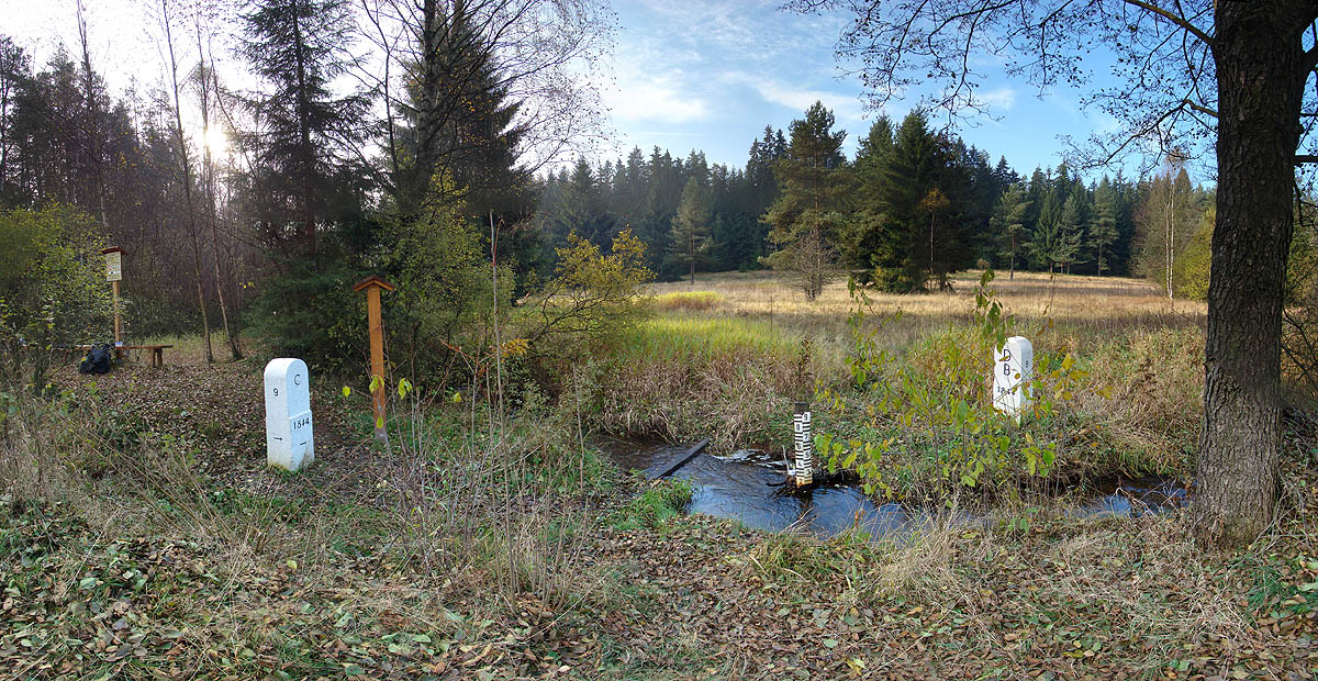 český hraniční kámen (v popředí) na břehu Újezdského potoka |