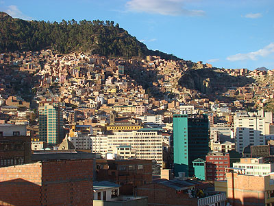 Při příjezdu do La Pazu je toto první pohled na hlavní město, který se návštěvníkům nabídne, když se přehoupnou přes okraj velkého kráteru na okraji předměstí El Alto.