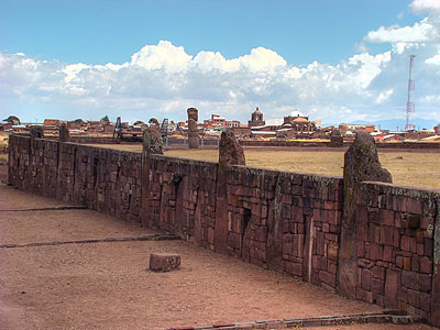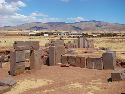 Po dobrém obědě jsme navštívili místo zvané Puma Punku - Brána pumy. Kdysi to býval hlavní vchod do areálu Tiahuanaco. V dávných dobách dokonce až sem dosahovaly vody jezera Titicaca. Dnes tu nejdeme několik velkých monolitů roztroušených v suché trávě.