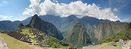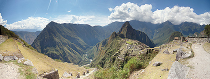 213° panorama složené z 26 fotografií zachycuje Machu Picchu z jižní strany. Vlevo pod terasami je dobře patrné údolí Urubamby, vpravo za terasami stojí chatrč hlídače Pohřebního kamene.