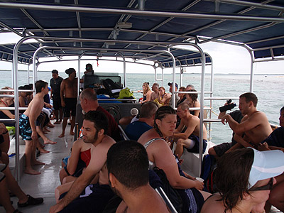 Naše loď tentokrát zakotvila dost daleko od břehu na volném moři, takže jsme se na pevninu museli nechat převést čluny. Cesta na břeh trvala zhruba 20 minut.